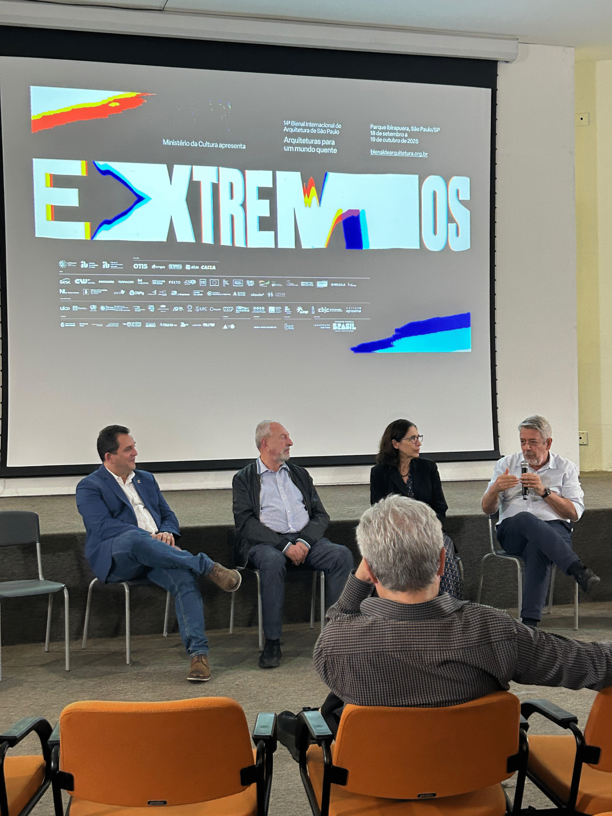 Encerrando a sessão, foi realizado um debate mediado por Renato Luiz Sobral Anelli, professor da Universidade Presbiteriana Mackenzie e curador da 14ª Bienal Internacional de Arquitetura de São Paulo. O diálogo colocou em perspectiva as falas dos palestrantes, articulando ciência, gestão pública e arquitetura como campos complementares para enfrentar a crise climática.