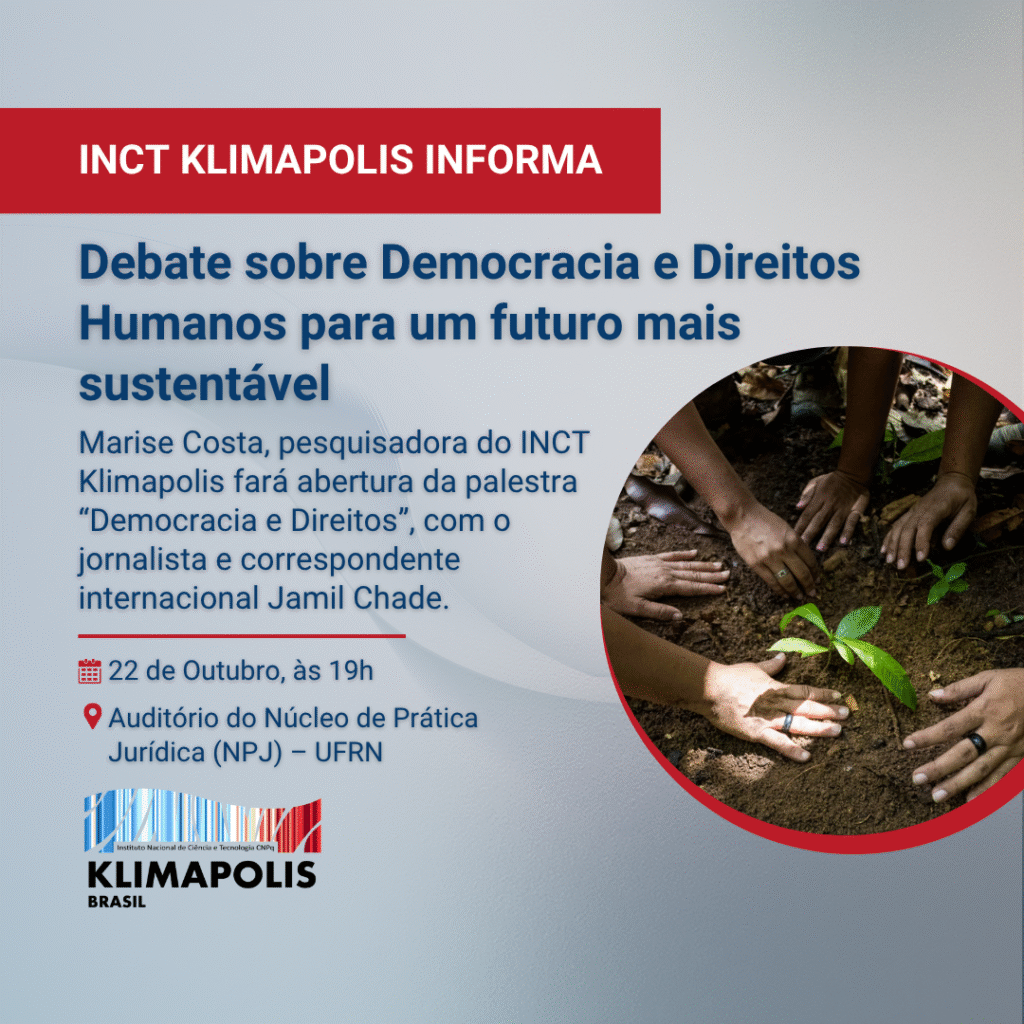 A pesquisadora Marise Costa, do Instituto Nacional de Ciência e Tecnologia para Mudanças Climáticas (INCT Klimapolis), fará a abertura do evento que recebe o jornalista e correspondente internacional Jamil Chade para a palestra “Democracia e Direitos”, na Universidade Federal do Rio Grande do Norte (UFRN). O evento é promovido pelo Observatório do Direito à Cidade Justa e Democrática (ObCiD), coordenado por Marise, em parceria com o Projeto Motyrum – Núcleo Urbano, ambos projetos de extensão da UFRN, e com a Procuradoria Geral do Estado (PGE).